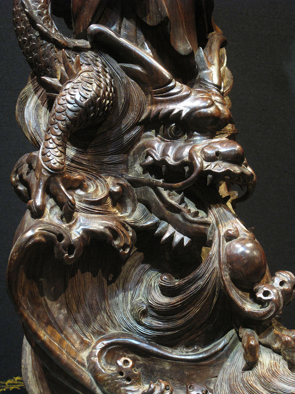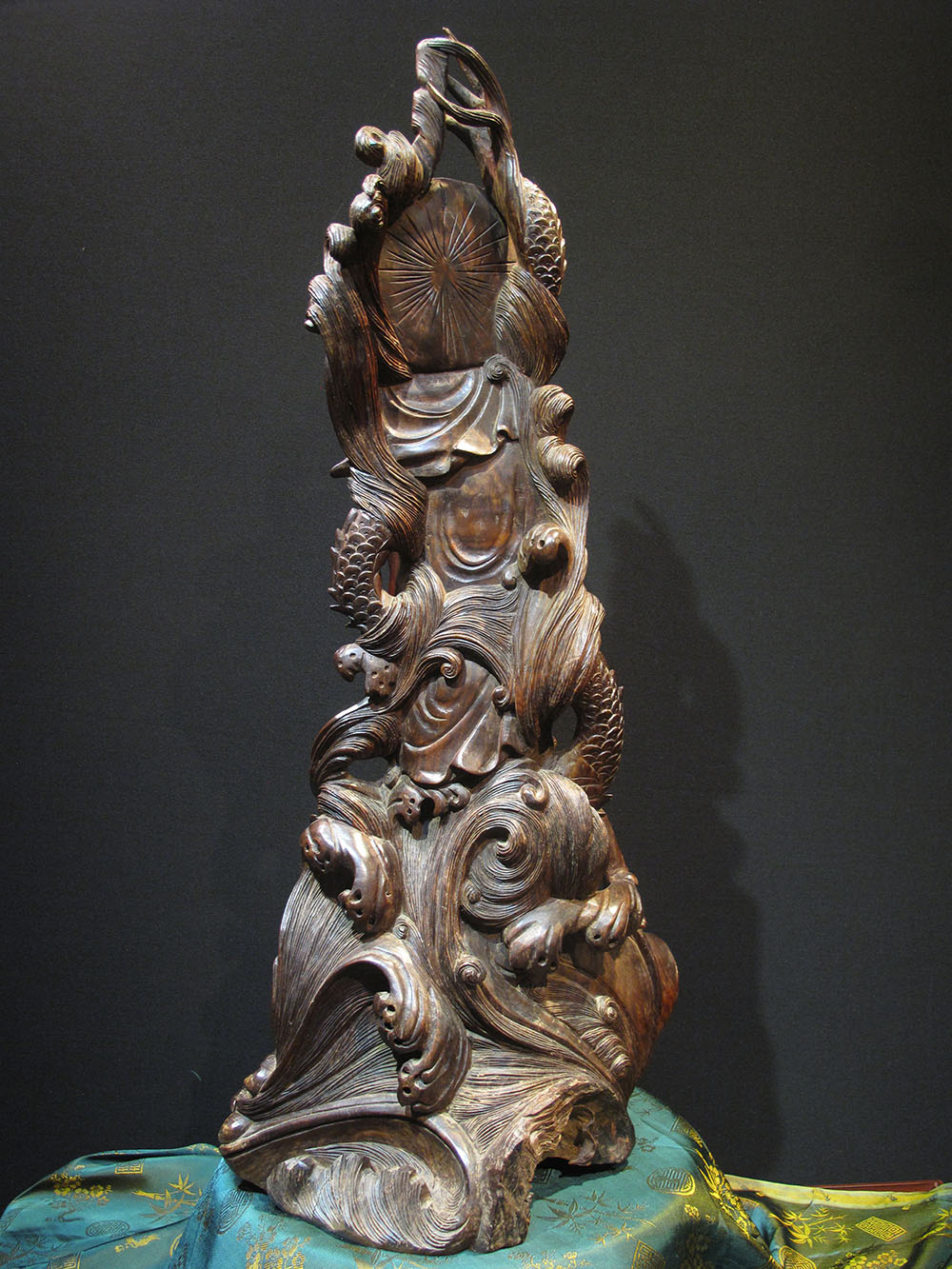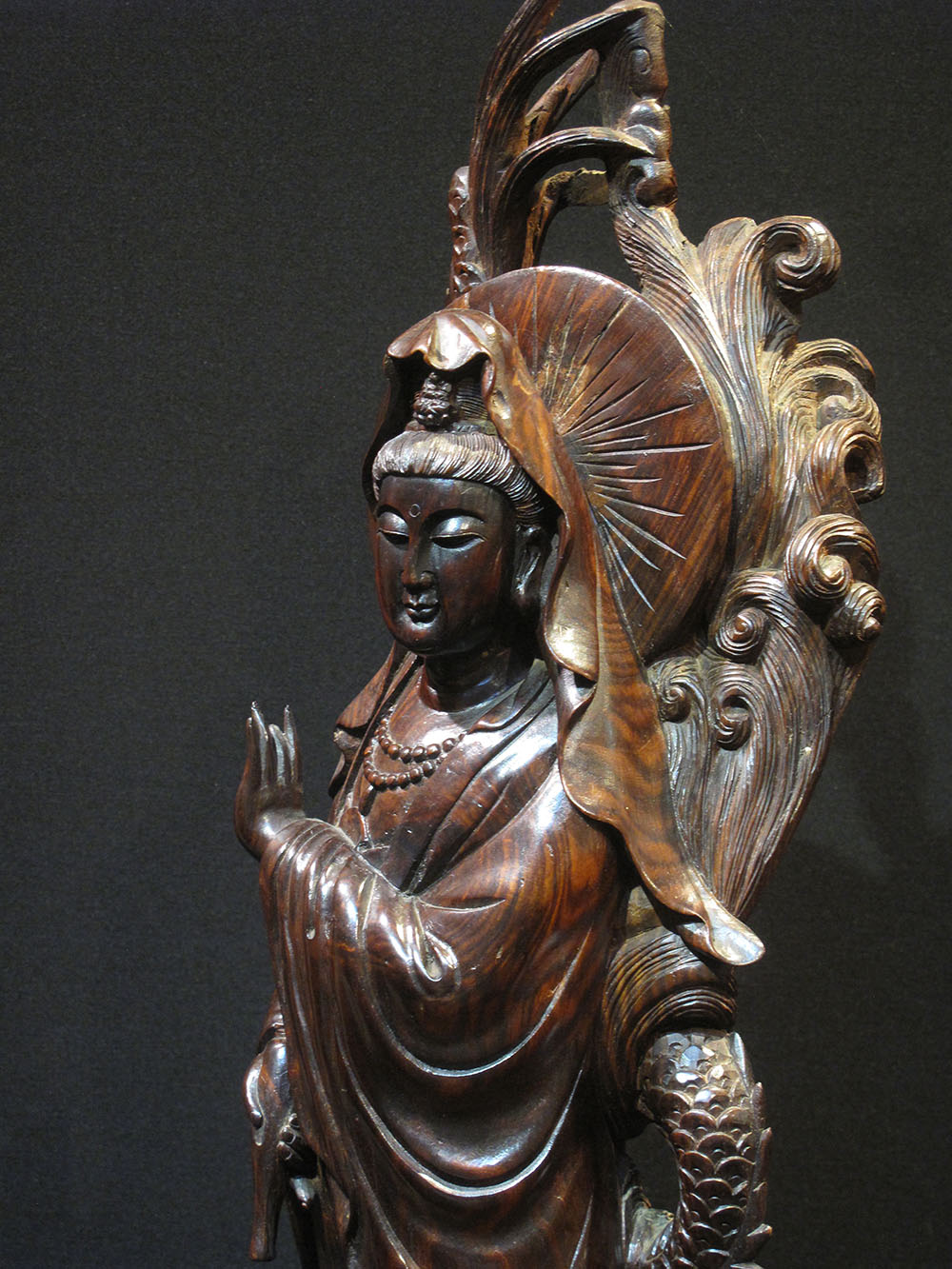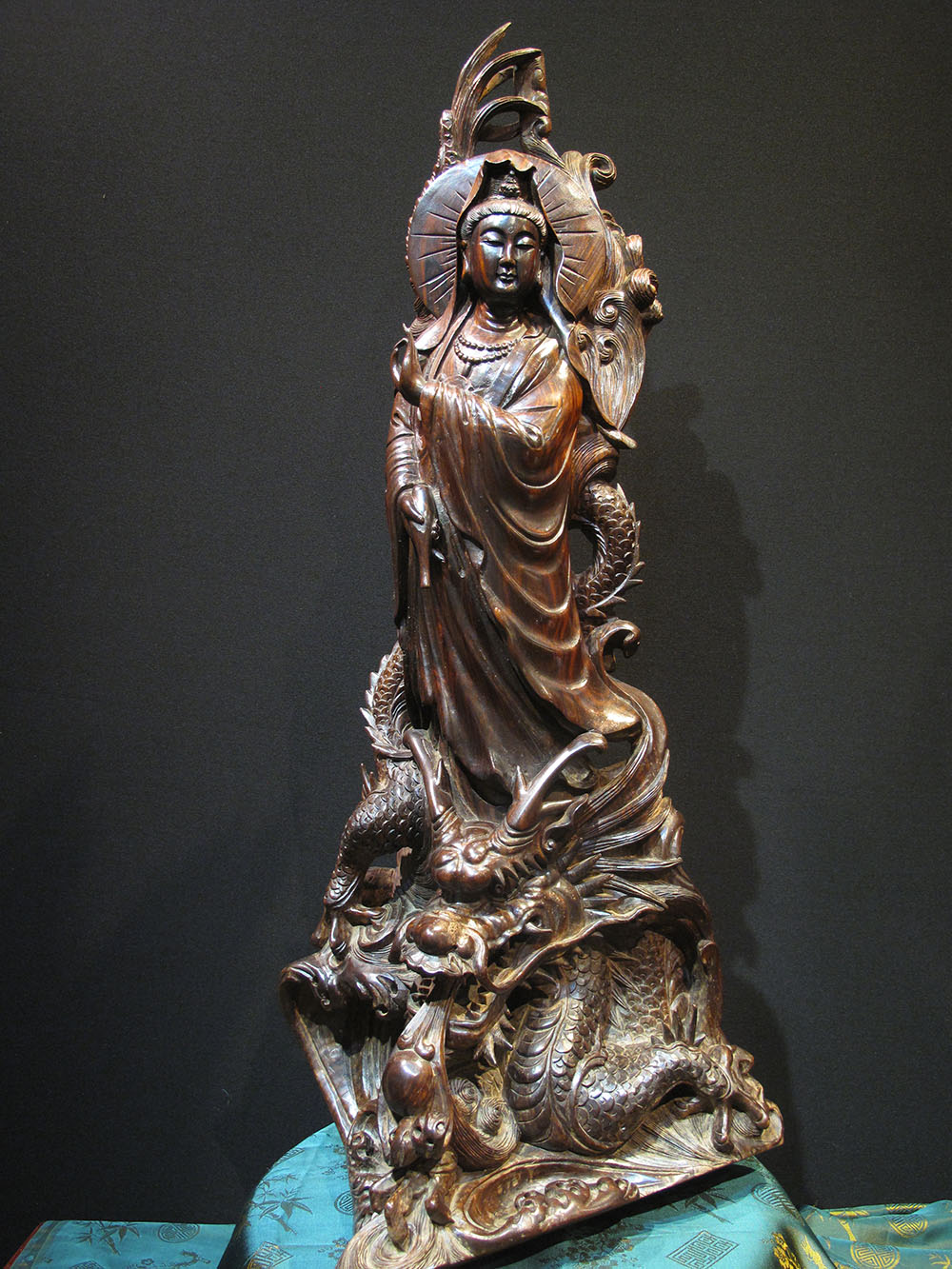 Vì Ngài là tiêu biểu sáng trong tâm linh Phật giáo nên người Nghệ Nhân có tâm Phật phải hết lòng vào tác phẩm này. Thật may có được một khúc gỗ Trắc tía quý hiếm như ý. Đức Quan Âm đứng trên Rồng tay bắt quyết, tay cầm bình tưới nước Cam Lồ xuống nhân gian. Nước Cam Lồ được tưới xuống đến đâu là chan chứa phước lành và tình thương đến đó, làm cho con người tỉnh ngộ trong vòng xoáy tham sân si. Khi con người tỉnh ngộ, sẽ không còn chiến tranh và mọi người sẽ mở lòng thương yêu và nhẫn nhịn nhau hơn.