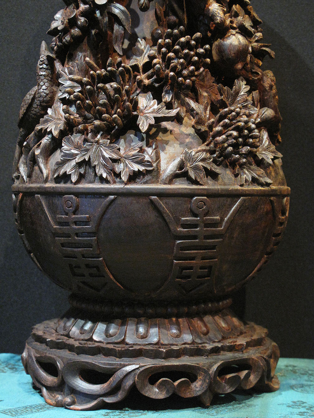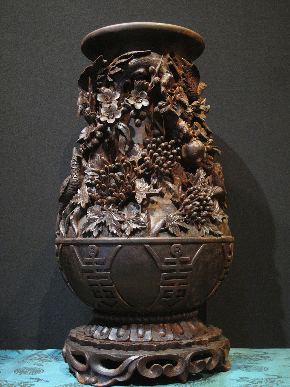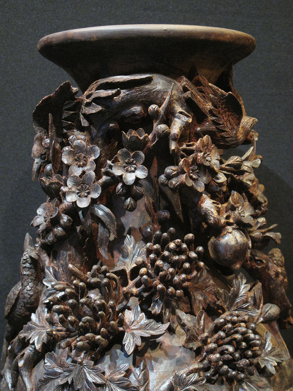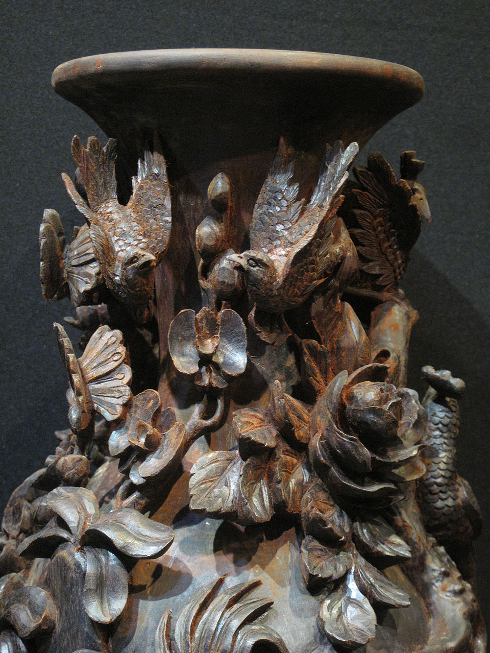 2 lọ hoa gỗ Tử Đàn chạm khắc nổi, được bàn tay của Nghệ Nhân trau chuốt ra từng cây Mai già, từng khóm Cúc móng rồng đến nhành hoa Phong Lan rừng đang nở rộ. Đáng mến nhất là cụm Hồng đua nở, và trên một vài cánh hoa có những chú bướm xinh đẹp đậu trên cành để thưởng thức vị hương của hoa. Hoa hồng còn là đại diện cho tình yêu lãng mạn và vĩnh hằng.